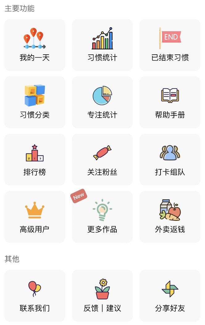 个人中心提供其他更多功能,如习惯和专注日志记录、帮助手册等