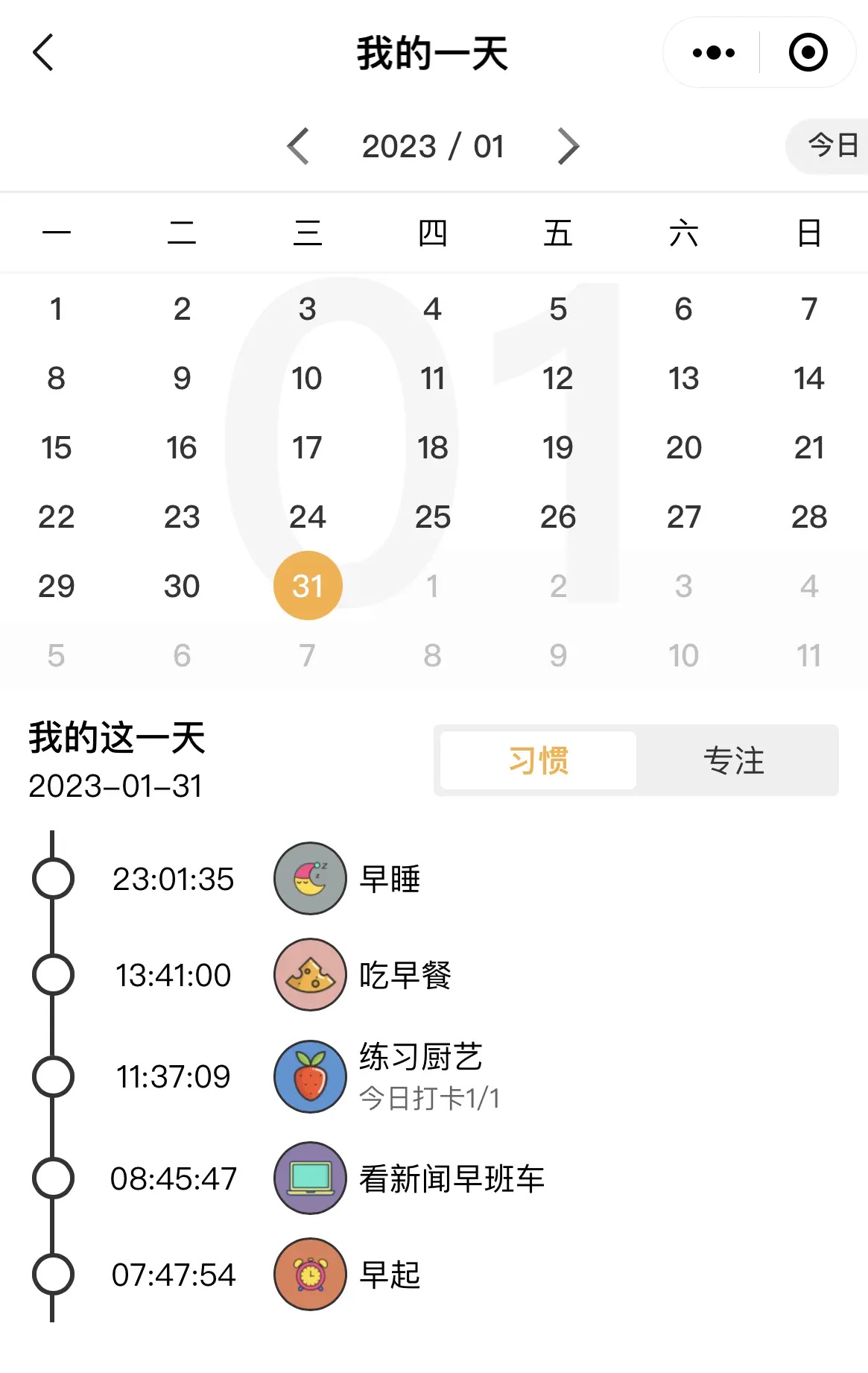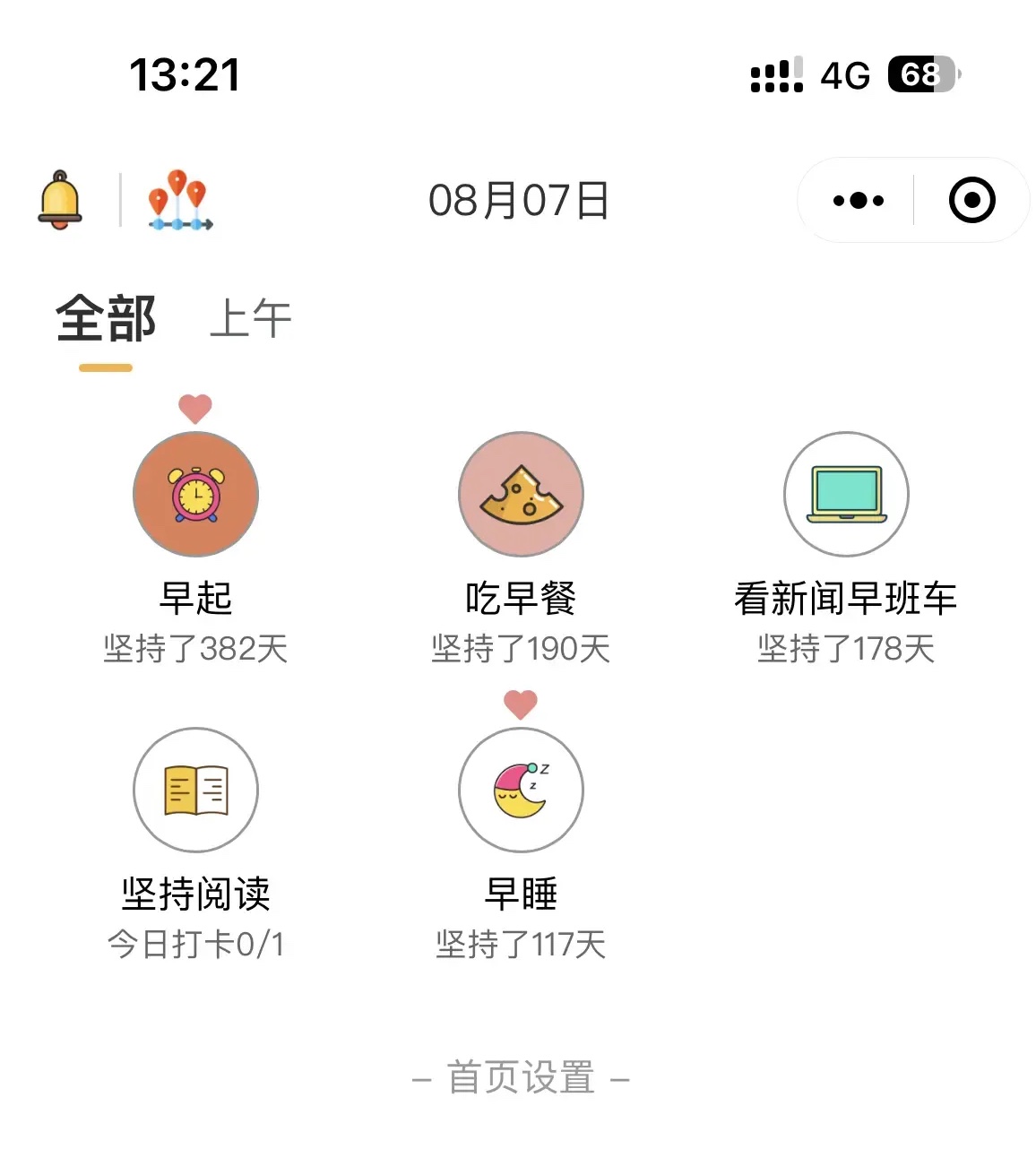 显示当天需要打卡的习惯,点击白色圈的图片即可打卡成功;(可操作单个习惯一天打卡多次)