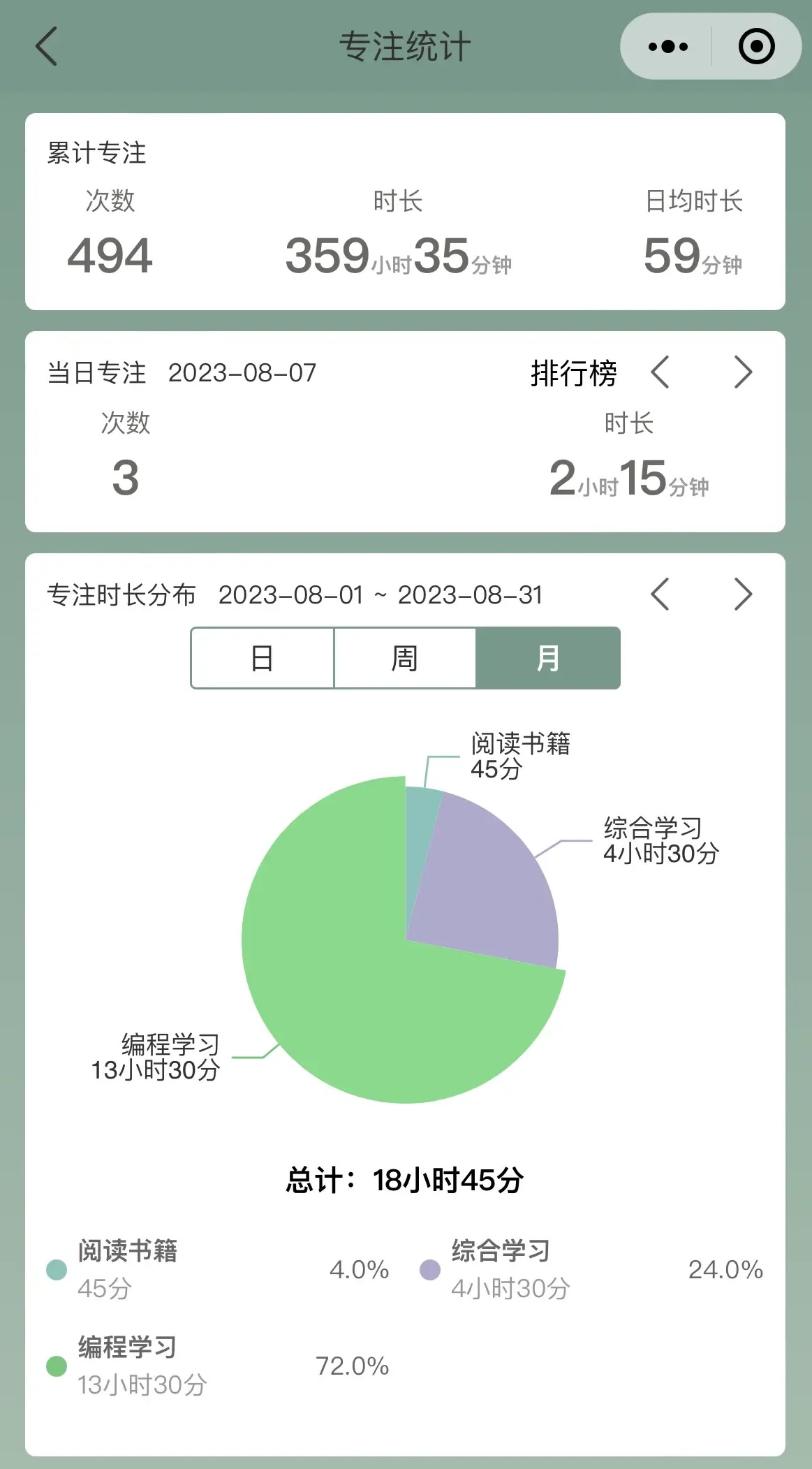 提供番茄专注倒计时,训练专注能力。专注统计数据显示如下: