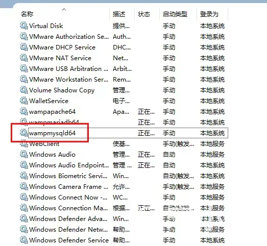 右击【此电脑】->【管理】->【服务】->【wampmysql64】进行启动MySQL服务。